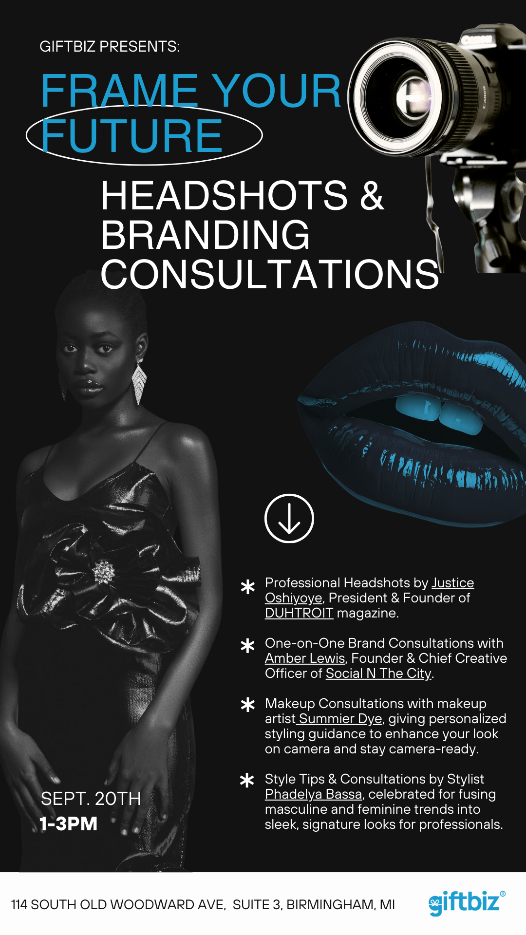 Join us for Frame Your Future: Headshots & Branding Consultations on Saturday, September 20, 2025, from 1:00 PM to 3:00 PM at 114 S Old Woodward Ave, Suite 3, Birmingham, MI 48009. Your brand is more than just a logo — it’s how you show up. This hands-on branding experience is designed for entrepreneurs ready to elevate their presence with professional headshots and expert consultations.